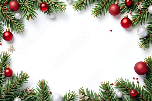 Christmas border with fir branches and ornaments on white background – festive holiday frame