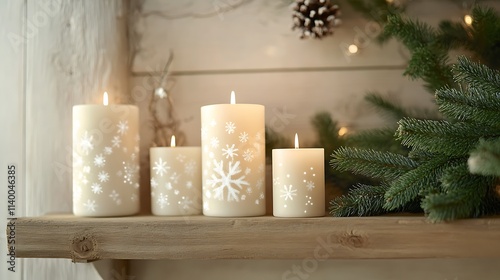Christmas Candles with Snowflakes and Pine Branches on Wooden Shelf