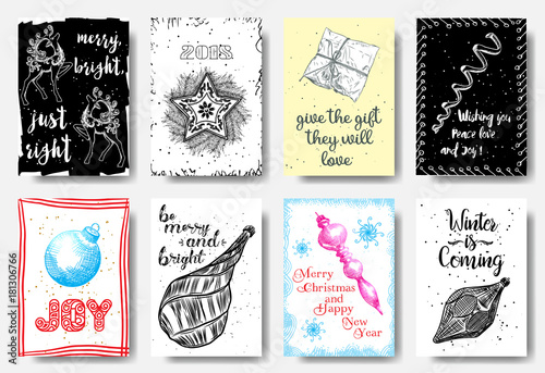 Christmas card tags set, hand drawn styleMerry bright just right, 2018, give the gift they will love, wishing you peace love and joy, winter is coming, Vector.