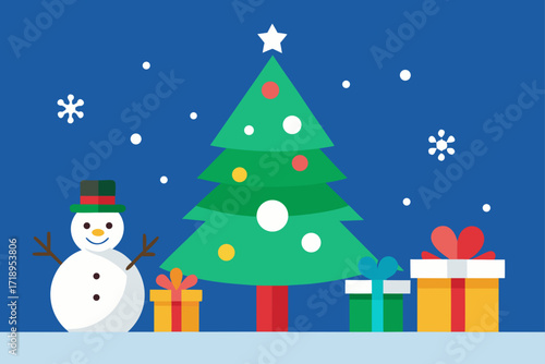 snowman, christmas, winter, snow, holiday, tree, christmas, hat, card, vector, snowflake, cartoon, cold, illustration, season, celebration, decoration, foulard, greeting, december, new, gift, design, new year, star