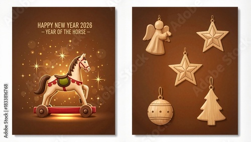 Christmas card with toy horse and wooden Christmas ornaments on creamy chocolate backgrounds