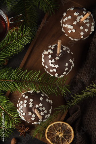 christmas, apple, chocolate, stick, sweet, dessert, food, background, eat, brown, winter, confectionery, fruit, hand-made, decoration, ornament, traditional, holiday, santa, kitchen, white, star, pine, tree branch, tradition