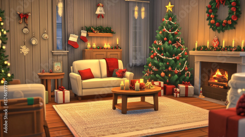Christmas composition of warm living room interior with christmas tree, balls, gifts, wooden coffee table, white armchair, candle, wooden consola and personal accessories. Home decor. Template.