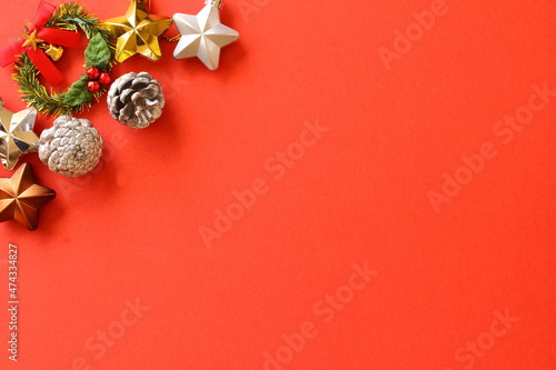 Christmas copy spaceframe for text with Christmas decoration on a red background.