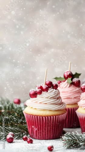 Christmas Cupcakes Delight: Two festive cupcakes adorned with sugared cranberries and holly, nestled amongst pine sprigs, evoke the warmth and sweetness of the holiday season.