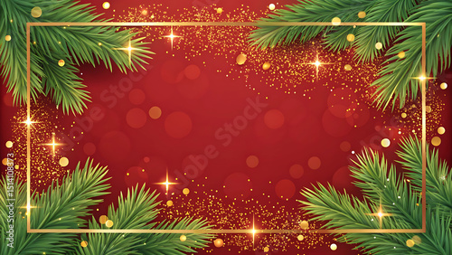 Christmas decoration border with fir branches and golden glitter confetti and sparkles of lights blur bokeh on red background. Bright Christmas and New Year design holiday frame. Vector illustration