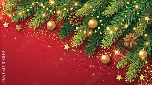 Christmas decoration border with fir branches and golden glitter confetti and sparkles of lights blur bokeh on red background. Bright Christmas and New Year design holiday frame. Vector illustration