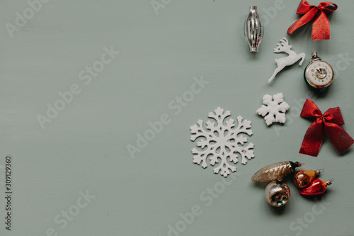 Christmas decoration Christmas tree toys new year gifts holiday green background