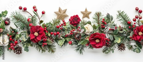 Christmas decorations on a white backdrop rose hips stars and fir branches. with copy space image. Place for adding text or design