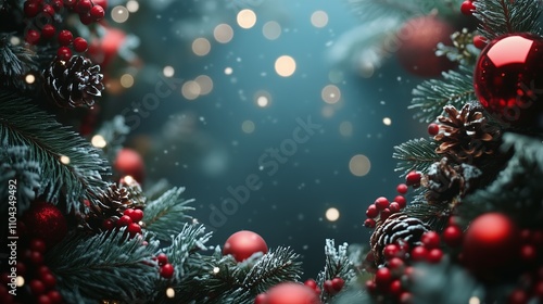 Christmas decorations with pinecones, red berries, and green branches on a blue bokeh background