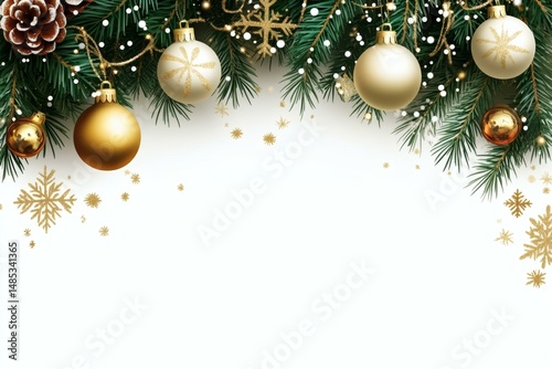 christmas, decoration, ornament, fir, branch, snowflake, gold, white, background, border, festive, holiday, winter, design, graphic, illustration, christmas bauble, pine cone, pattern, decoration, seasonal, celebration, new year