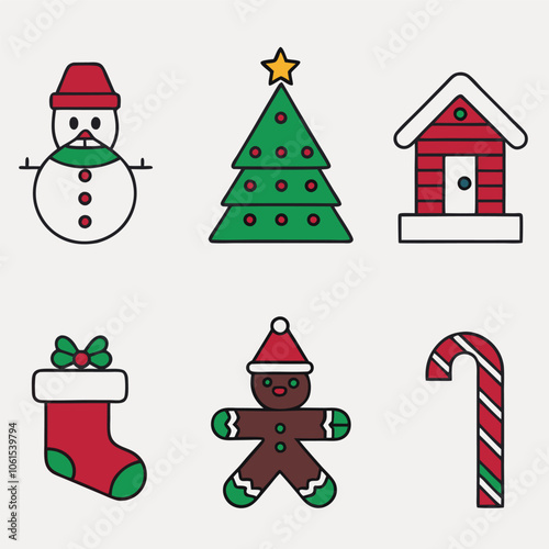 christmas, santa, holiday, claus, tree, winter, new year, set, christmas tree, gift, snowflake, snowman, illustration, snow, vector, cartoon, decoration