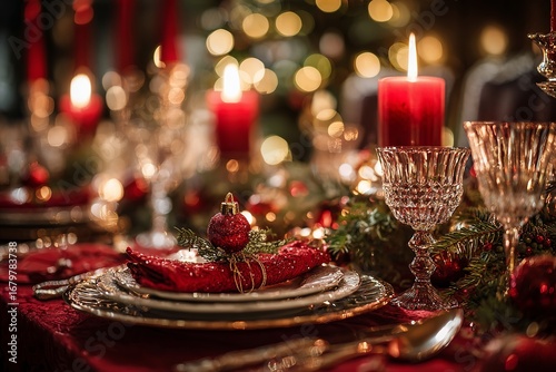 christmas, holiday, festive, dinner, dining, table, setting, decoration, decor, red, gold, candle, candle, crystal, glassware, plate, elegant, luxury, celebration, feast, christmas eve, seasonal, cosy, warm, light, bokeh, ornament, greenery, garland, centrepiece, lifestyle, party, traditional, event, family, hospitality, winter, champaign
