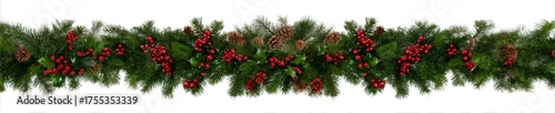 Christmas Garland with Pinecones and Red Berries on White Background.
