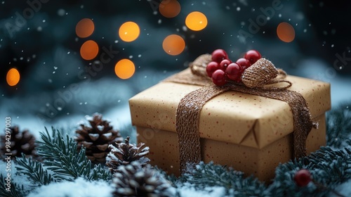 Christmas Gift Box, Fir Branches And Pine cones, On Snow With Christmas Lights