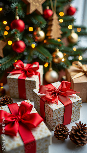 Christmas gifts with red ribbons under decorated tree with ornaments and lights