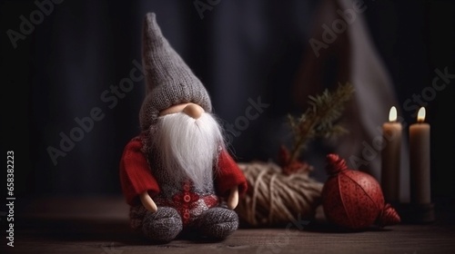 Christmas gnome toy on a dark background with a candle in the dark. Generative AI.