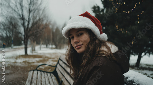 Christmas hat young woman winter park snowy bench festive mood outdoor portrait holiday season casual clothing cold weather evergreen tree