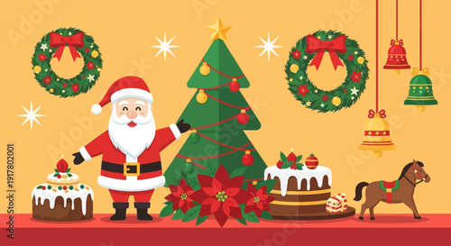 christmas, holiday, santa, festive, decoration, winter, season, celebration, tree, chaplet, bell, cake, christmas flower, toy, horse, cartoon, illustration, traditional, joy, merry, background, happy, gift, present, spirit, december, red, green, gold, white, sweet, dessert, bakery, frosting, berry, candle, star, ornament, bow, ribbon, childhood, new year, table, display, fun, cheer, home, party