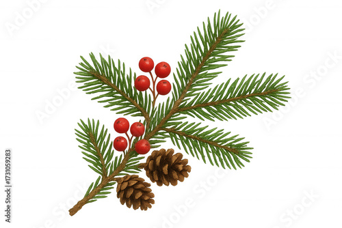 Christmas holiday pine branch with red berries and pinecones for festive winter decoration