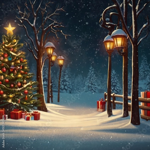 christmas, winter, snow, house, landscape, tree, holiday, night, christmas, card, illustration, village, season, vector, home, celebration, sky, cold, snowflake, scene, new, santa, year, eve, decoration