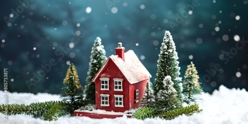 Christmas house in winter snowy forest. holiday Christmas ornament decoration, Copy space. banner and poster.