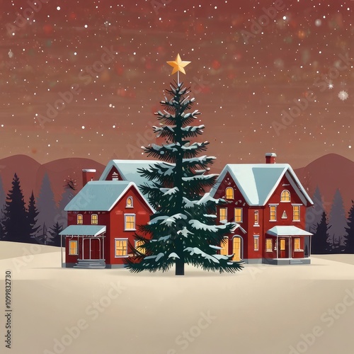 christmas, winter, snow, house, night, holiday, landscape, christmas, tree, vector, illustration, village, snowflake, season, scene, cold, santa, celebration, sky, card, home, new, town, new year, bungalow