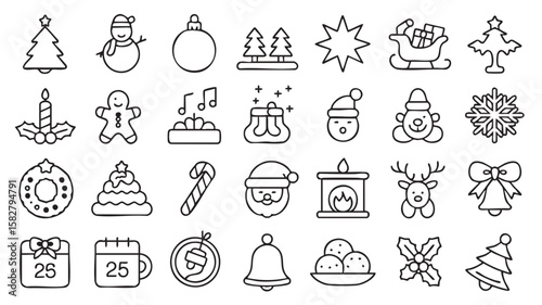 christmas, holiday, celebration, festive, icon, symbol, christmas tree, snowman, bauble, sleigh, star, candle, holly, music, stocking, santa, reindeer, snowflake, chaplet, candy cane, fireplace, bow, bell, calendar, gift, mistletoe, cookie, winter, greeting, decoration, design, graphic, outline, minimal