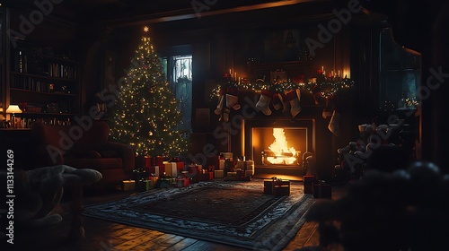 Christmas interior filled with festive charm featuring a glowing tree glowing fireplace and holiday gifts in darkness