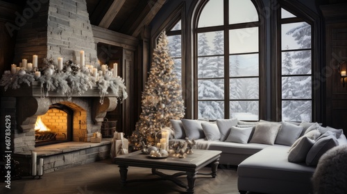 Christmas interior of a large cozy house with a Christmas tree and a fireplace, AI