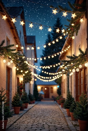 Christmas lights - stars string hanging at fir branches in abstract defocused background christmas background Ultra realistic Photorealistic picturesque scenery