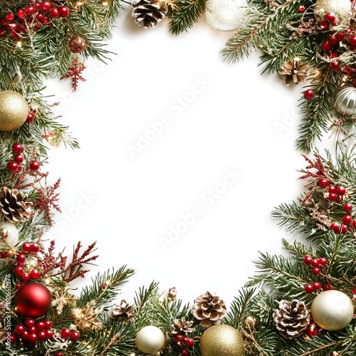 christmas, paper, new, blank, ornament, frame, year, background, festive, christmas, composition, bauble, decoration, decor, decorative, element, object, banner, poster, border, card, greeting, 2025, gold, red, green, colourful, pine, spruce, branch, tree, winter, holiday, celebrate, celebration, wood