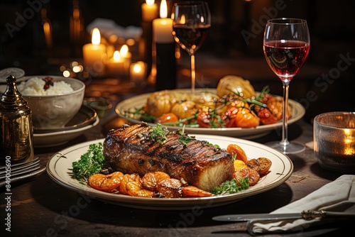christmas, night, dinner, food, table, plate, goggles, wine, steak, photo, candle, background, festive, holiday, delicious, culinary, cookery, epicure, meal, elegant, celebration, atmospheric, cosy, detail, seasonal, feast, plate, eatery, salad, meat, dish, lunch, vegetable, glasses, red, sauce, healthy, vegetable, dining