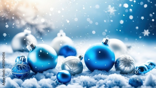 Christmas ornaments, blue and silver baubles, snow, winter scene, soft focus, bokeh lights, festive atmosphere, holiday decorations, cold color palette, glitter, shiny surfaces, macro photography, sha
