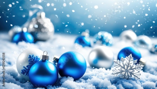 Christmas ornaments, blue and silver baubles, snow, winter scene, soft focus, bokeh lights, festive atmosphere, holiday decorations, cold color palette, glitter, shiny surfaces, macro photography, sha
