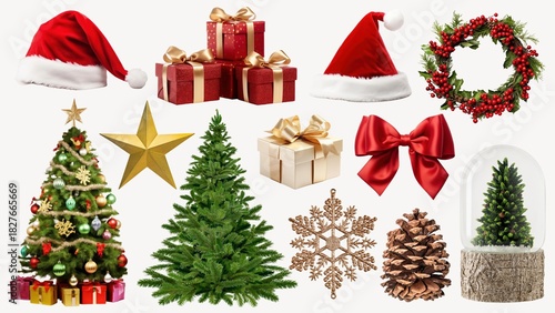christmas decoration, christmas wreath, christmas gift, christmas tree, holiday season, celebration, collection, gift box, pine cone, snowflake, christmas, ornament, festive, holiday, season, winter, chaplet, box, cone, decor, santa, gift, gold, hat, pine, star, tree, bow, set, seasonal, decoration