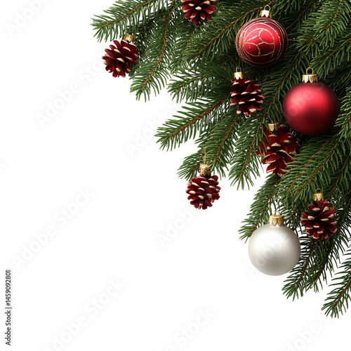 Christmas ornaments on fir branches. Red and silver baubles and pine cones decorate a festive corner arrangement.