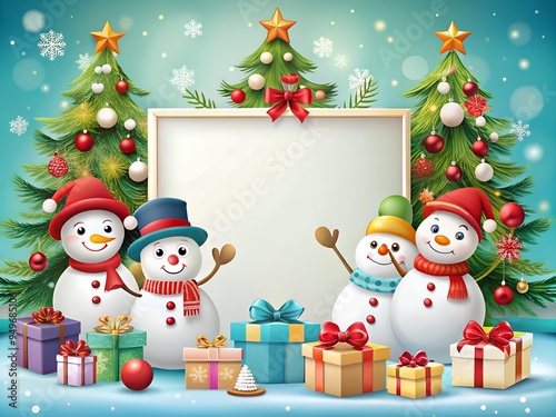Christmas party greeting card with cute snowman, Christmas tree and gift box. Designed for sending greetings on social media and posters.