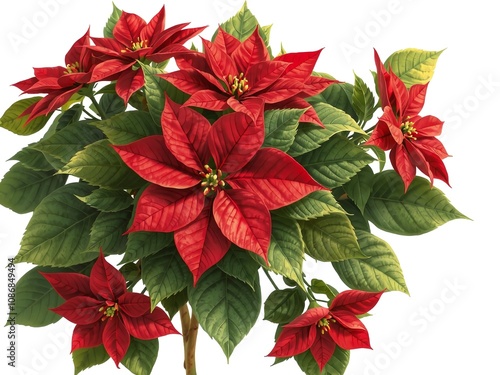 Christmas Poinsettia bright red poinsettia plant, with green leaves and a clean, white background