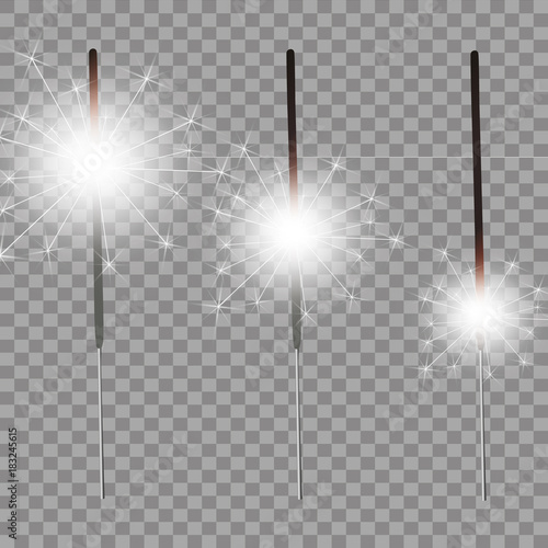 Christmas realistic bengal light effect. Isolated sparkler light vector design elements. Transparent template of glowing sparkler for Xmas Holiday greeting card design. Happy New Year decoration light
