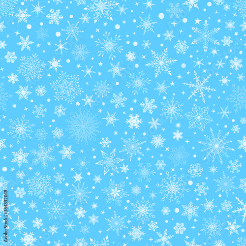 Christmas seamless pattern with various complex big and small snowflakes, white on blue background