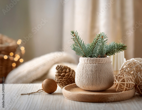 christmas, decoration, tree, pine, celebration, holiday, winter, fir, christmas, tree branch, candle, cone, table, ornament, brown, nature, green, season, ball, closeup, spruce, scandinavian, bohemian, natural, eco, pine cone, wool