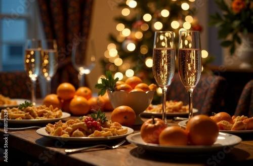 christmas, christmas, table, new year, party, setting, mandarin, mandarin orange, champaign, glasses, drink, celebration, holiday, alcohol, new, decoration, year, beverage, goggles, food, gold, dinner, 2, celebrate, eve, gift, festive