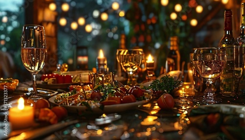 christmas, holiday, decoration, tree, celebration, light, christmas, candle, light, year, new, glasses, champaign, wine, gold, table, ornament, winter, decoration, night, gift, festive, gold, party, celebrate