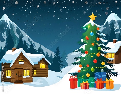 christmas, christmas tree, winter, background, colours, beautiful, sky, snow, blue, bauble, green, tree, holiday, christmas, illustration, landscape, vector, house, snowflake, season, celebration, night, forest, scene, cold, card, decoration, new year, star, nature, design, december