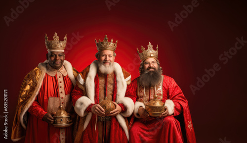 Christmas tradition. The Three Wise Men smiling with robes and crowns holding presents over red background with copy space