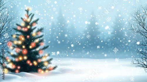 Christmas tree and christmas lights on abstract snowy landscape background, xmas background concept with advertising space transparent background