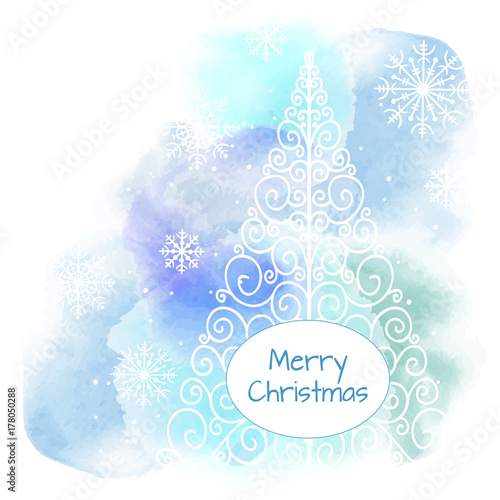 Christmas tree and snowflakes on a gentle watercolor background. Vector illustration.