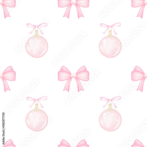 Christmas tree ball, bow. Watercolor seamless pattern on white background in pastel colors. Cute winter illustration for Christmas