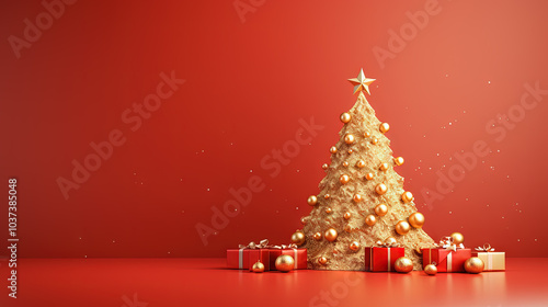 christmas, tree, card, holiday, background, red, gold, three-dimensional, fir, ball, design, celebration, decoration, winter, christmas, season, festive, year, gift, happy, ornament, merry, new, illustration, december, present, banner, poster, light, eve, greeting, decorative, object, traditional, abstract, box, party, realistic, flier, wallpaper, new year, star, symbol, gold, bauble, copy, space, christmas tree